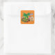 A small green dragon sits on a wooden cutting board on a kitchen counter top. Baked goods are all around. Cookies, muffins and cupcakes all around the kitchen dragon in a backdrop of orange