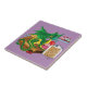 A small green dragon sits on a wooden cutting board on a kitchen counter top. Baked goods are all around. Cookies, muffins and cupcakes all around the kitchen dragon in a backdrop of purple