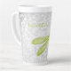 Enjoy your latte or morning coffee with a Green Dragonfly Personalised Latte Mug. Mug design features a colourful dragonfly, a soft white leafy vine against a light grey grunge damask background with an area to personalise with your name. Additional gift items available with this design as well as a variety of colours.