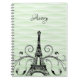 Jot down important notes or reminders with a Green Eiffel Tower Flourish Notebook. Notebook design features the Eiffel Tower adorned with elegant flourishes against a green wavy background. Additional colours available with this design as well. This item may be personalised with a name or monogram of your choosing. Please contact me if you need assistance with personalisation.