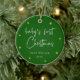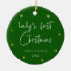 Green Minimalist Elegant Star Calligraphy and Photo Baby's Frist Christmas Ceramic Ornament, Front feature with " Baby's First Christmas" text, gold star and personalised baby name. Back you can personalised baby photo.