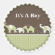 These stickers can be used on cupcake sticks or on the back of your baby shower invitation. You can also change the wording. The design is green elephants marching in a row behind one another.
