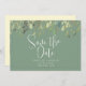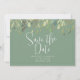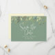 Modern Save the Date announcements feature watercolor watercolor eucalyptus leaves border on basil green background with green customisable text blocks in modern fonts. Add custom wedding website QR code on back.