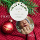 Watercolor eucalyptus greenery leaves and a classy handwritten style calligraphy script making a beautiful boy or girl baptism personalized Christmas keepsake white tree ornament.