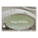 A beautiful architectural designed building in soft taupe accented by an oval green faux glitter window for you to add a message in or leave the words Happy Birthday as is.