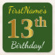 Green, Faux Gold 13th Birthday + Custom Name Square Paper Coaster