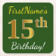 Green, Faux Gold 15th Birthday + Custom Name Square Paper Coaster