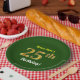 This simple, personalised, birthday-themed paper plate design features a customisable message like "Name-Here’s 25th Birthday!", where the name can be changed, and with the "25th" having a faux/imitation gold-like appearance. It also features a green coloured background. Paper plates like these could perhaps be used at a party being held to celebrate somebody’s twenty fifth birthday. [~Z0000145]
