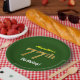 This simple, personalised, birthday-themed paper plate design features a customisable message like "ANameHere’s 77th Birthday!", where the name can be changed, and with the "77th" having a faux/imitation gold-like appearance. It also features a green coloured background. Paper plates like these could perhaps be used at a party being held to celebrate somebody’s seventy seventh birthday. [~Z0000145]