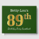 This guest book design features the ordinal number "89th" with a faux/imitation gold-like appearance. It also features a personalised name, and a green coloured background. It could be used at a party for somebody celebrating their eighty ninth birthday. [~Z0000056]