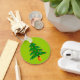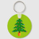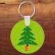 Illustration of a bright green Christmas tree. A gold star sits on top and the tree is dressed up with pink, blue and orange decorations.