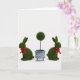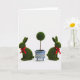 Designed with a balanced still-life layout, this card shows three decorative pieces arranged neatly on a bright white background. In the middle stands a round green topiary on a slim stem, set into a blue-and-white ceramic pot with tiny lattice cutouts and small feet. On either side sit two green bunny figures 🐰 with upright ears, bead-like dark eyes, and fuzzy, moss-like texture. Each bunny wears a red bow at the neck, and their slight inward angle suggests a tender, companionable closeness 🐇. Soft, diffused lighting highlights the contrast between the bunnies’ textured surface and the pot’s smooth glaze, keeping the greens, reds, and blues easy to notice. The greeting text is placed near the top in a gentle green color, with a smaller line beneath it in soft blue. The white space around the trio stays open and airy, framing the topiary and the two bow-tied bunnies.