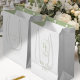These lovely white wedding favour bags feature couple initials monogrammed and framed with a soft green floral border and 'thank you' text at the front, against a white background. The back includes optional text area, couple names and date. The inside top border, also features the same soft green colour, creating a chic elegant bag with youthful appeal.