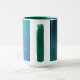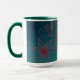 This blue and green mug with teal accents features an original drawing based on henna mehndi designs. Dark green to aqua background with a floral pattern in maroon red makes a colourful morning wake-up.