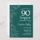Teal Green Surprise 90th Birthday Party Invitation. Minimalist modern design featuring botanical accents and typography script font. Simple floral invite card perfect for a stylish female surprise bday celebration. Can be customised to any age. Printed Zazzle invitations or instant download digital template.