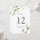 This Wedding Table Number features painted watercolor leaves in various shades of green.