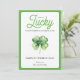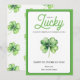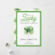 Green Four Leaf Clover Luck Happy St Patricks Day Holiday Card features a green and white colour scheme with green four-leaf clover against a white background. The colourful "Lucky" script and black "Happy St. Patrick’s Day" text bring festive cheer. The backside is filled with a charming four-leaf clover pattern for added detail.