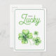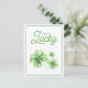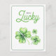 Green Four Leaf Clover Luck Happy St Patricks Day Holiday Postcard features a green and white colour scheme with three green four-leaf clovers set against a white background. The colourful "Lucky" script and green "Happy St. Patrick’s Day" text bring festive cheer.