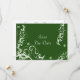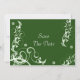 This Green Flourish Save the date features white flourish and swirls on a green background.