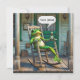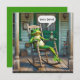 A relaxed frog lounges on a wooden rocking chair while holding a beer bottle on a rustic porch for a birthday party.