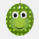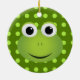 This frog ornament is perfect for any frog lover! It features a design of a cute green cartoon frog with a big smile. The frog is on a dark green background with light green polka-dots.