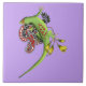 A green gecko with red markings is on a tribal black, red and white tribal design in backdrop of purple