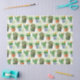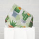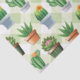 Houseplant succulents on a green gingham background, Aloe vera, Prickly Pear cactus, Golden Barrel cactus and Aeonium.
