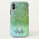 This girly green marble and green glitter mobile phone case can be personalised with your name and monogram iphone xs case.