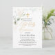Green and gold foliage gender neutral First Holy Communion Invitation. This design features an illustration of green and gold foliage in watercolor style and faux gold cross. On the top of the card - greenish and golden effect confetti.