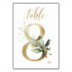 Beautiful table number card with a botanical motif - a watercolor illustration of green and gold leaves. Table 8. Please, check all available numbers