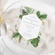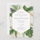This wedding invitation features green watercolor tropical palm, banana and monstera leaves and simulated gold foliage. It has a matching pattern back. Trendy geometric backgrounds with hexagons, circles and diamonds with simulated gold accent borders. This collection has wedding invitations, save the dates, rsvps, menus, and labels. Great for summer, destination, and beach weddings!