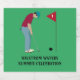 Bright grass green golfer, wearing a cap, red shirt and blue pants, putting a golf ball into a hole design bottle label. Customise the text.