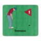 Bright green personalised golfer, wearing a cap, deep red shirt and blue pants, putting a golf ball cutting board.