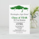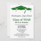This vertical format minimalist class reunion invitation design features black and green text on an all white background with three green graduation caps as the top border. The back is a matching solid blue. Personalise your information, remove information or edit using the design tool to select a font colour, size, and style your prefer.