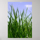 This photographic image is a bug's eye view of green grass with blue sky in the background.