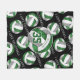 This sporty volleyball team spirit fleece blanket for girls features a large green, grey and white artsy, stylised volleyball, upon which her name and jersey number can be personalised, overlying a pattern of smaller green, grey and white volleyballs and the sporty font text "I love volleyball" that stretches between the angled rows of volleyballs - background is customisable black - by katz_d_zynes