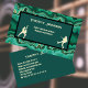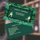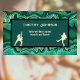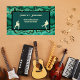 This dramatic guitar teacher business card front features an electric dark green, emerald, and gold swirl in the background, with golden silhouettes of guitarists dancing in the foreground. Your name and music lesson info appear on a dark colour block of emerald green. You can edit the instrument and lesson text how you'd like as long as it fits the alloted space.