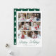 Modern holiday card featuring 6 of your photos arranged in a collage layout. "Happy Holidays" is displayed in a handwritten green script with your family name and the year shown below. The multi-photo holiday card reverses to display a green and white Christmas tree pattern.
