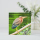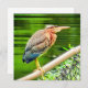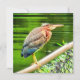 A bird with a long beak stands perched on a metal railing, next to a chain-link fence and greenery, with a serene body of water in the background. The scene is vibrant with lush foliage and reflections in the water.