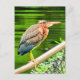 A bird with a long beak stands perched on a metal railing, next to a chain-link fence and greenery, with a serene body of water in the background. The scene is vibrant with lush foliage and reflections in the water.