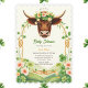 This elegant St Patricks Day themed baby shower Invitation features a charming Highland cow adorned with a wreath of green shamrocks and soft pastel flowers. The frame is surrounded by rolling green hills, delicate white clovers, and golden Celtic knots.