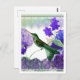 A beautiful iridescent green hummingbird perched on a delicate plant stem, surrounded by purple and blue flowers, including Hydrangeas, bordered by multi-colour crystals, seafoam green pearls and purple lace design elements.