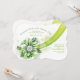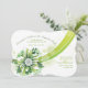 A contemporary, floral invitation in shades of green on white featuring an fanciful daisy with a grunge background. (FV)
