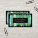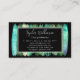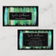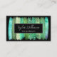 This elegant and glamourous business card features green iridescent brush strokes with sequins and glitter on a black background. The text combines handwritten script and modern sans serif fonts for a classy and sophisticated look. This is perfect for make up artists, beauticians, spas, fashion stylists, interior design and more.