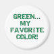 Green text reads "Green is My Favourite Colour!" on environmental awareness T-shirts, mugs, buttons, stickers, tote bags, and other items that promote keeping our world clean and saving the planet!
