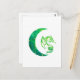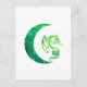 a decorative design of a crescent moon and a dragon or lizard in tattoo style dancing on the edge of it in jade like green colours on a postcard.