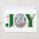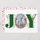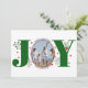 Green Joy with berries Christmas photo Holiday Card. It showcases the word "JOY" with red berries and greenery while instead of the letter "O" there is your photo. The back includes red polka dots.