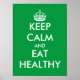 Green Keep calm and eat healthy poster. Make your own funny keep calm and carry on parody for promoting a healthy lifestyle and eating right against obesity. Vintage keepcalm typography template with crown. Customisable quote for men women and kids.