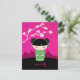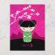 Green Kokeshi postcard - with happiness kanji, and cherry blossom on pink background.