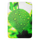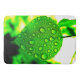This bathmat has a green leaf with water droplets on it.